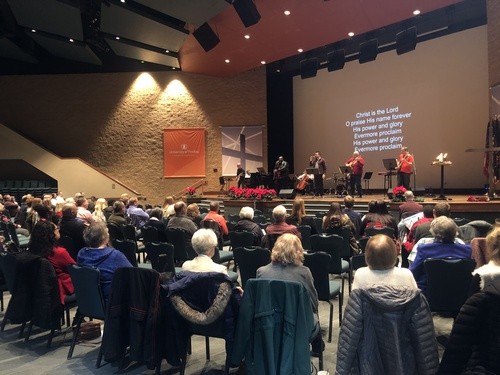 Ample seating is available in the Auditorium. You can sit in the main seating area or up in the balcony. Space is available for those in wheelchairs. If you would like to move chairs around to accommodate your situation, please feel free to do so.