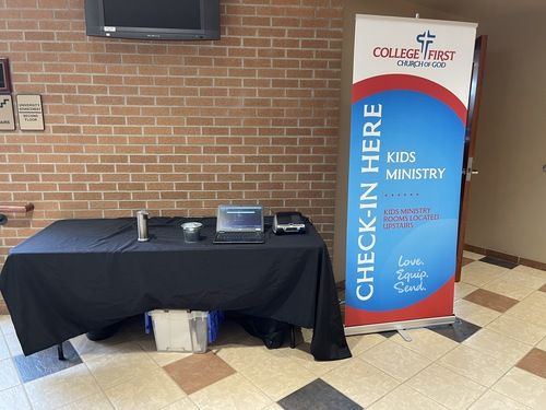 All kids Infant through 5th Grade will need to start by checking-in. The Kids' Check-In is located near the Main Stairway centered between the two entrances into the building. If you've been at College First before, simply look up your name and print your tags. One copy stays with the guardian and the other gets placed on the kid. If it's your first time at College First, someone will be present to help you enter your information for the first time.