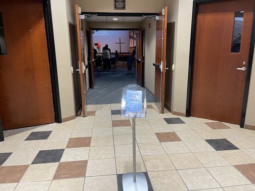 As you enter, you'll see the Kids' Check-In located straight forward next to the main stairway. Our Resource Table and Coffee, Tea, and Donuts are also located near the center between both entrances. The Auditorium entrances are on your left as you come in the South Entrance and on your right if you come in the West Entrance.