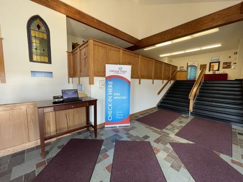 Just inside the Main Entrance is our Welcome Desk. If you have any questions regarding being at College First for the first time, you'll find your answer there. You'll also find our Kids' Ministry Check-In just inside the doors on Sunday Mornings.